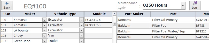 Thank you but that is the same result that I was receiving before. For 250 hours, excavators should only show Filter Oil Primary and Filter Fuel Water Sep. It is currently showing all parts that are attached to excavators. To see what parts should show per Maintenance cycle go to 'Edit Parts for Maintenance cycle' and choose the vehicle type and the Maintenance cycle.