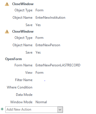 What I would like to do is have the EnterNewPersonLASTRECORD form open up with the value that was just entered into the EnterNewInstitution form's Institution Name field (which in the Institution table is simply "Institution") prefilled in the Associated Institution combo box. Is this possible? I have tried futzing around with TimeStamp DESC criteria in the form's source query and tried a Where condition in the event pictured above, but none of my attempts have worked out.