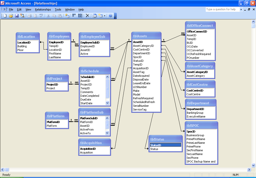 I have created a relational dB (picture included of layout). When I try and create a query and include tblAssets and two or more tables that is in a one-many relationship with tblAssets linked by the AssetId field I can not update any records in the query, wheter it is through a form or query.