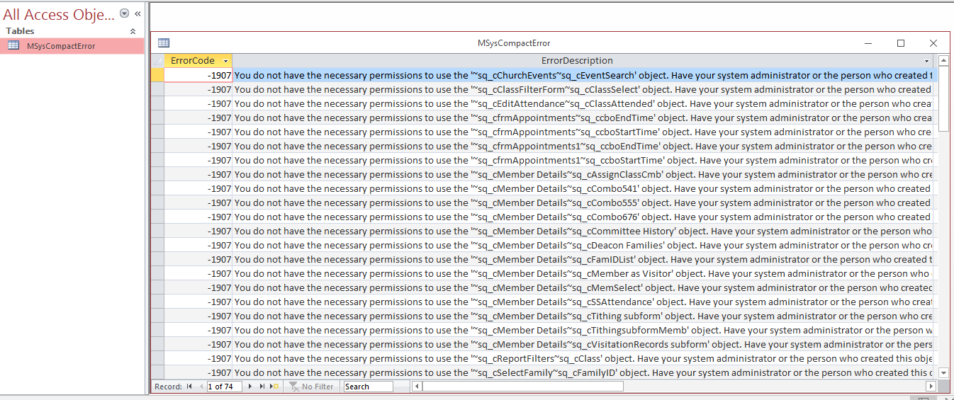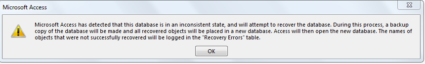 I've been working from scratch on a database for my church. For the last couple weeks I've been working on a directory via a series of subreports (just so it will all print together. I was working on some collages for the events that have happened this year when all of a sudden my laptop told me the database was unavailable. I saved everything that was opened (which was only one form and a table), closed the db, then opened it back up. Now when I open it, I get an "inconsistant state" error (picture attached). It says it will repair the db and then goes about a quarter of the way on the repair bar, the freezes. It creates a backup while doing this, but the back up just does the same thing. If I click on the original file (or even the last back up made) I just get one table that says a bunch of errors (also attached).