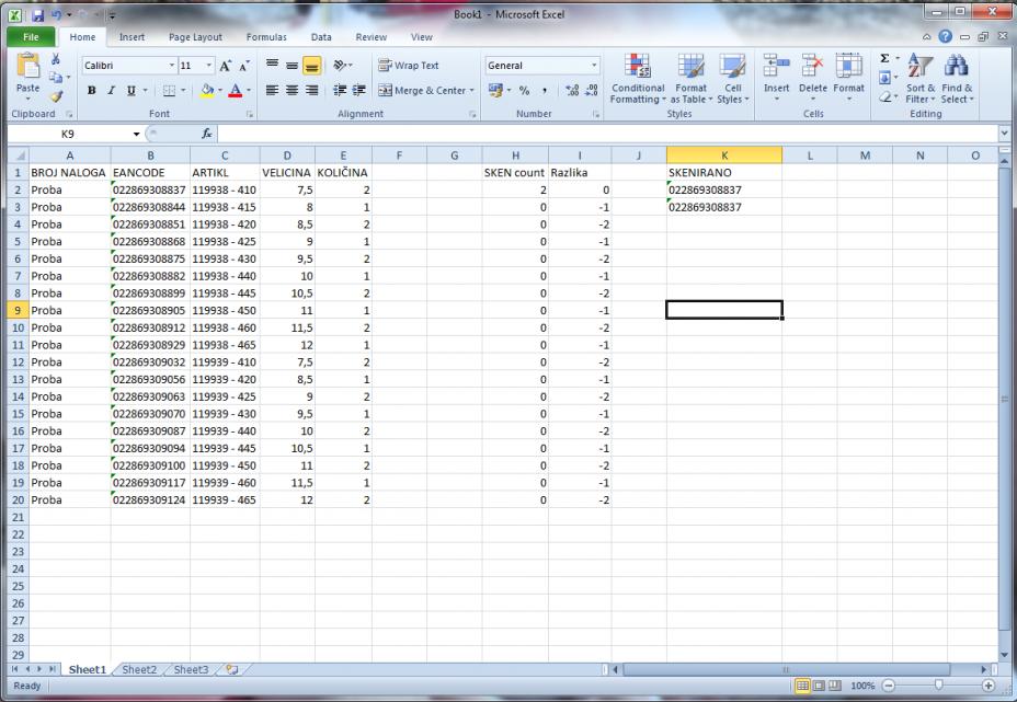 I need a little help with making criteria in excel. As is evident from the image attached here is a simple order by the scanner. Using COUNTIF formula I made that every bar code that is scanned in row "K" verify barcodes "B" and thus get a result in the row of the "H" and "I". In this case, the order of "B" me as a base. What interests me now, how do I make the criteria in the case to be scanned bar code that is not in the right "B". I would want to throw me a pop up window in which to write the "wrong bar code"