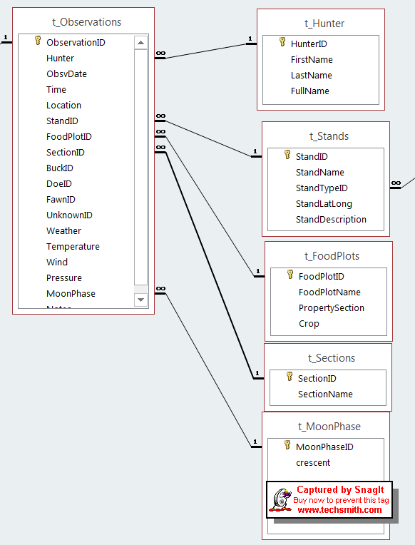 I have a table called observations (for observing deer), in that table is a field called Location, I have 3 other tables that list possible locations t_foodplots, t_stands and t_section.