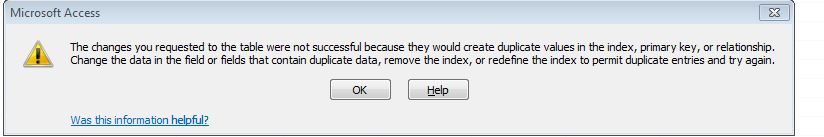 jdraw Super Moderator Staff member Local time Yesterday, 19:35 Joined Jan 23, 2006 Messages 15,499 Nov 1, 2016 #3 Tell us about your application, database and table design. Access is merely warning you of a condition that should not happen n your set up, and preventing it from happening. We need more info to advise on how to stop it from happening.