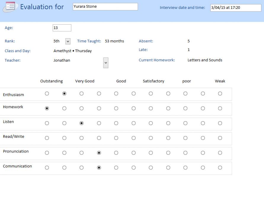 I'm really happy that I went to a database format, but I'm having problems showing the grades in a more graphical way. Right now, it just reports the grades but the parents preferred the other format.