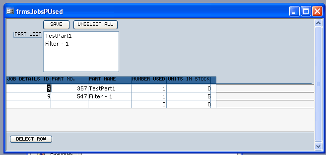 I have a subform called frmsJobPartsUsed, which contains a multiselect list box where the user can select multiply parts used for one job and click a save button, which saves the parts to rows on the same forms (see picture). The user then enters the number used and that number is taken away from the UnitsInStock.