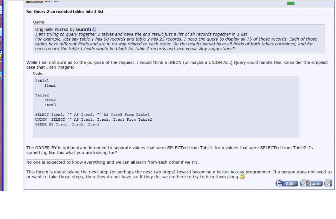 thanks thats exactly what I needed. The actual use for this is as follows: In simplest explanation, I have to different order tables (unrelated to each other). I need a form based on those tables listing ALL orders from each table. So even though its a form, i guess technically it is a report that I need.