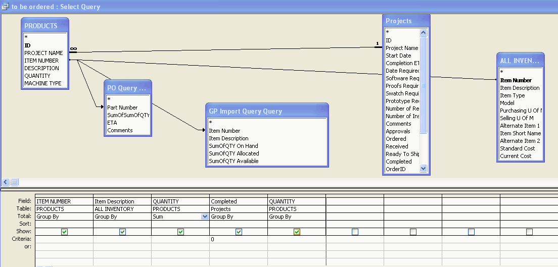 Hello. I have a Project database that has a query to calculate the quantities that need to be ordered. Items are entered in a subform which populates a table. I created a query that takes the QTY Needed subtracts QTY on hand and Qty on order. The first query pulls the QTY needed from the table and what I want is for it to sum what is needed for each part number. What is happening is for certain items it is generating numbers that are way out of whack.