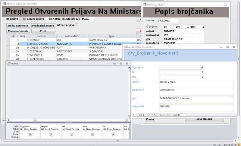 I have a form that displays information in a subform (manufacturer, serial number and inventory number) about slot machines that I need to repair. When I double-click on a machine, another form comes up, based on the manufacturer. I use those forms to input the counters for that slot. That means I can have six different forms (but only one at the time). They are identical, only labels are different, because each manufacturer has their own names for them. After I save those counters to a table, I'd like to print out a report with those counters on it. I know I could create six queries, but is there a way to use just one query and pass the textbox name from active form as a criteria for the query?