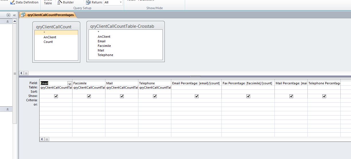 My problem is if I choose a client where we have not received a job by a particular method (say web or facsimile), the last query working out the percentages has fixed names to cover each method but naturally produces an error when it cannot find a corresponding method of receipt. I have experimented with NZ() without success.