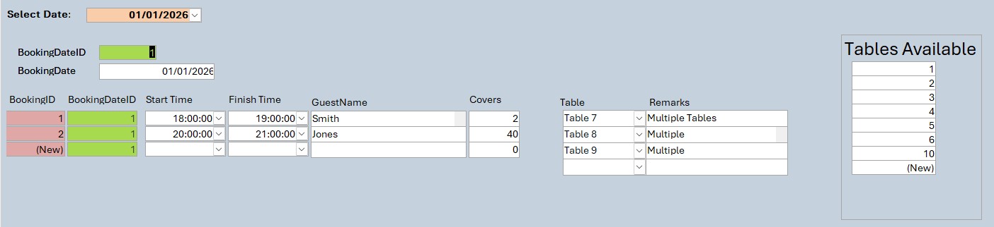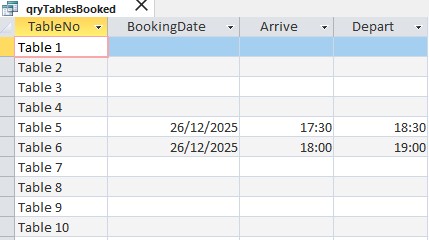 This query returns all available tables/time slots for the whole of the period covered by the auxiliary calendar table. In booking systems like yours the query is normally restricted on the calDate column to a range of dates from the current date (returned by the Date() function) to however many days beyond that for which you would anticipate taking bookings for (returned by Date() + n). The query can then be used as the RowSource property for a combo or list box .