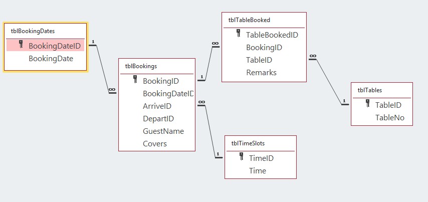 I have now added up to 15 joins available for Restaurant Tables, so in my database (which I can't really upload as it is large and has various parts to it) In my table tbl_Net_RestaurantTables I have the Fields TableNo, J1, J2, J3 ... J15. When Table name 'Join 6 & 7' is selected I save 3 records in to my Bookings table; 1 showing Table Name Join 6 & 7, another showing Table Name T6 and another showing Table Name T7 - this was how the query worked out which tables was available at the time.
