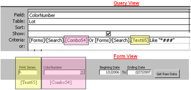 I have a query filtering question. Please note attach pic for further details. I am trying to put together a search in a form to seach for a certain color or color series from a Qery from two two different sources (from a Combo Box and from a Text Box). I am not sure how to set this up in the query.