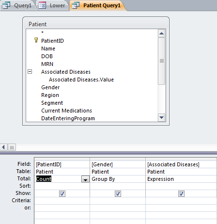 the combo-box is working fine (Pic1) and I needed to calculate number of associated diseases for gender(M,F...etc) so I created a query (pic2 and pic3) and a pivot-chart to do so.