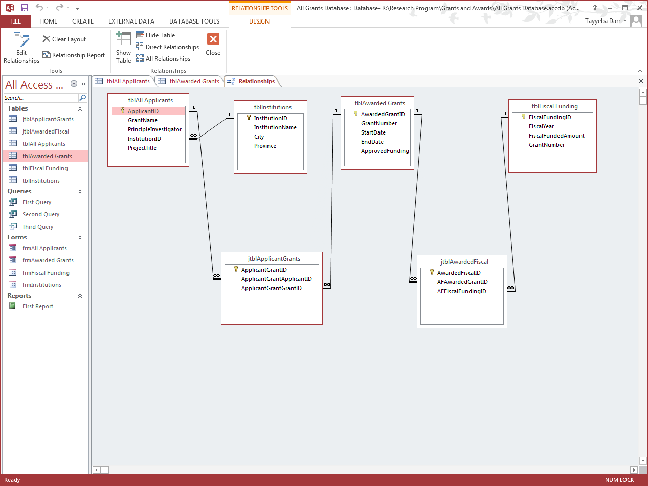 What I'd like the query to do is pull all the applicant data from tblAllApplicants (of both successful and unsuccessful applicants) and merge this with data from tblAwarded Grants, so that I end up with a query that displays all applicants and awardees are noted because those records have GrantNumbers associated with them.
