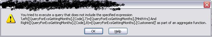 HAVING (((Left([QueryForExsGettingMonths].[code],7))=[QueryForExsGettingMonths].[MnthYrs]) AND ((Right([QueryForExsGettingMonths].[code],8))=[QueryForExsGettingMonths].[Customerid]));