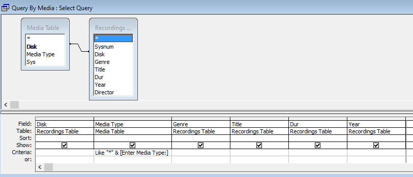 Just FYI- using LIKE is rarely appropriate for "codes" like media type. It is more commonly used for actual text like names or addresses. A media type is a small, controlled list and an item can easily be selected using a combo and used with the "=" operator rather than "Like *".
