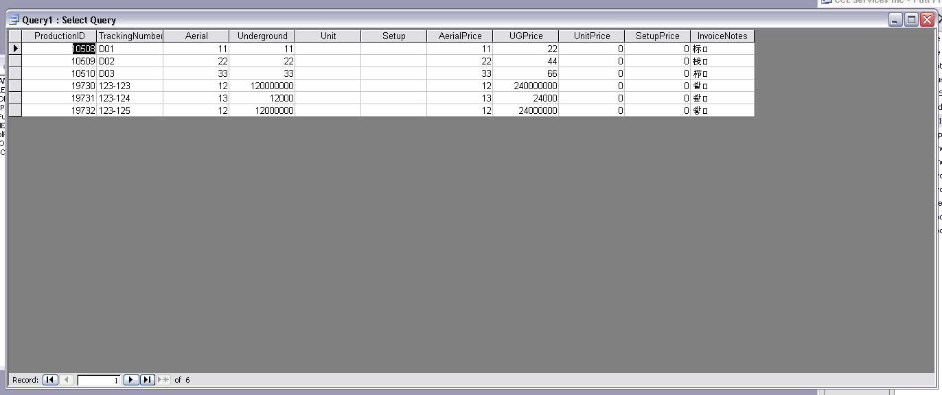 I have a tabular query that is based off of a crosstab query. My problem is that whenever I try to add a string field to my problem query, it shows an Asian character (not sure which language) and a square. I know it's not corruption because I double checked the table and it's in the table correctly. Meanwhile if I add another date or number field, it works fine. Please also see the attached screen shot. Any ideas?