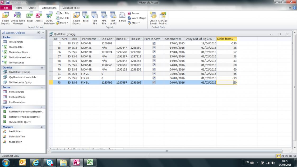 I have a table where by parts move through the factory and when they reach that area a guy ticks the box in the data base and enters the date it was there.