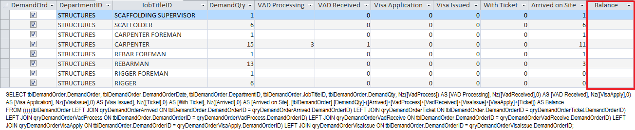 What I would want is to make a summary out of the two tables, where the query will count how many candidates are there in that specific job title and have a field of status say, field of Count of Arrived, Count of Visa Processing and etc., and a field where I can add all of the count of candidates per status and deduct the result to the demand quantity where that field would be named Balance.