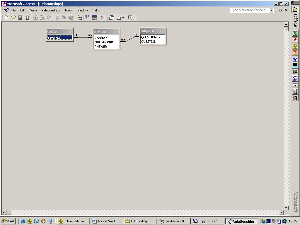 My form attempt included a form, with a control source of tblcase, and then a subform with control source tblMain, linked by case no. On the subform I had 3 controls case no, a combo box for questionid which dispalyed the full question using tblQuestions and then a check box. Viewing my attachment will explain this all. This is working but as I mentioned above this involves alot of end user work and as the questionnaire will contain 70+ questions. This method also doesnt ensure that all questions will be answered.