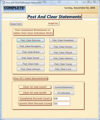 Each cardholder must verify the transactions and assign GL codes to each line of data and return the spreadsheet.When each spreadsheet is returned the data is appended to an Accounts Payable table "CompletedRecords" and a "Annual History" Table. Then at the end of the month the the CurrentStatement is purged for a new month.
