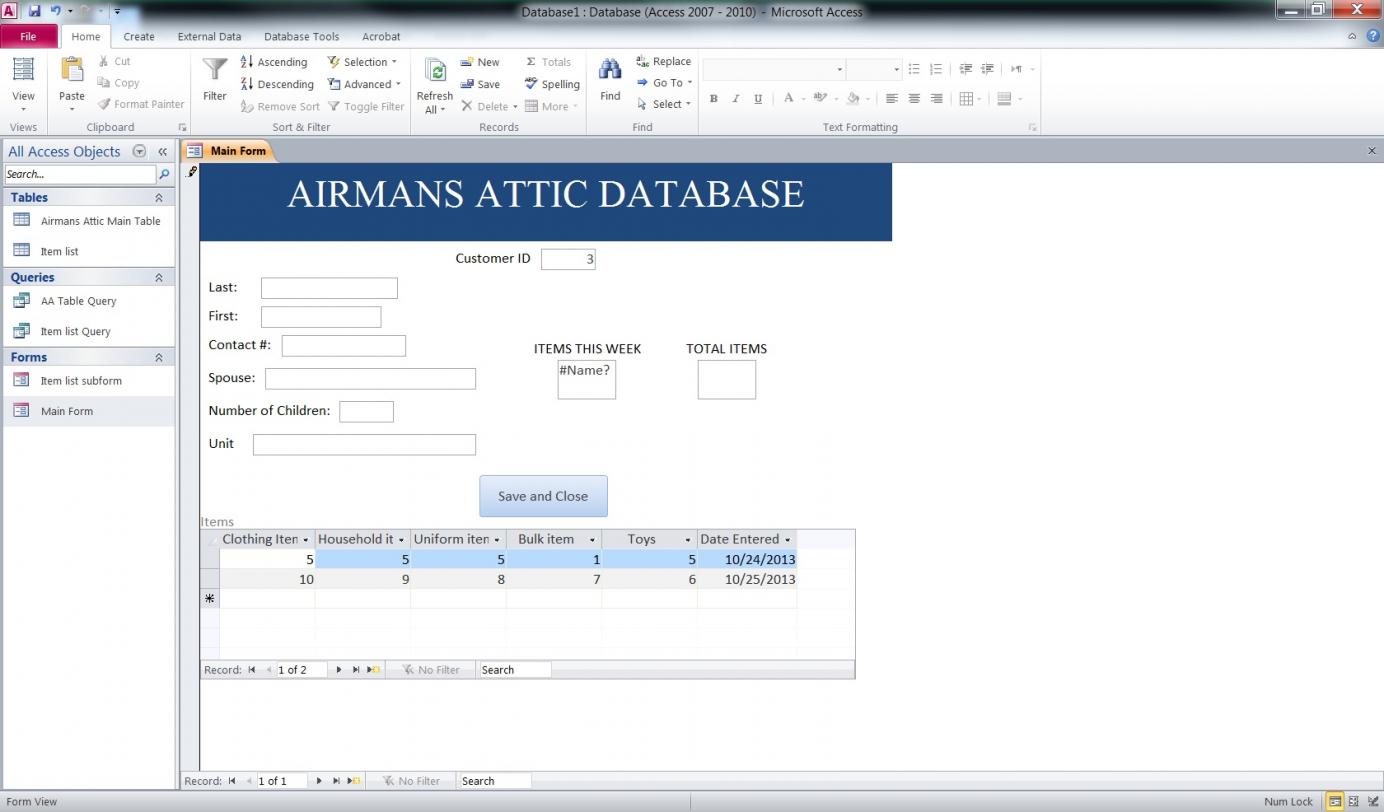 I have a subform for user input. It has 5 columns for the user to input the number of each item given away, [Uniform Items], [Toys], [Household Items], [Clothing Items], [Date Entered].