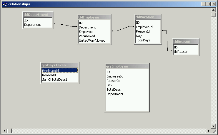Again, the tblVacation can have a VacationID rather than ID and this can have the number field EmployeeID linked this time to the primary key in tblEmployee as one employee can have many vacations.