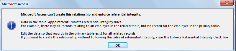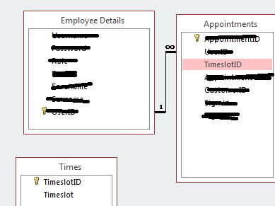 The error mesage is telling you are trying to create a one to many relationship but can not because you have values in timeslotID of appointments table (the many side of the relationship) that do not appear in the times table (the one side of the relationship)