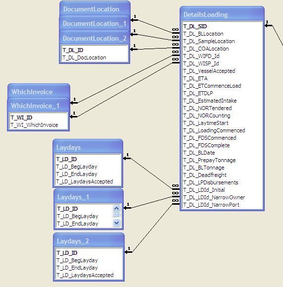 Each set has a beginning date and end date and has to be accepted. The dates can all be different. My idea was to have one table with all three beginning, end and accepted fields feeding the details loading table with the ID relevant to each record in the laydays table.