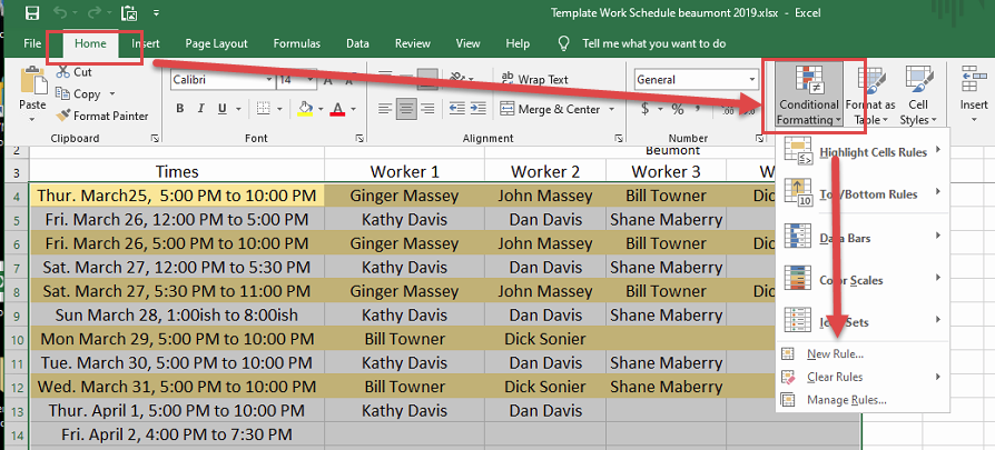 That was because Minty thought you were talking about Access?It was so long ago that I made it that I don't remember. That is the first thing I tried to remove the conditional formatting. I don't use excel much. I tried to implement Misty's suggestion but could not find the Detail section format properties. I did a google to find where it is located but came up dry there also. I am planning to make a work schedule for people working in TX with me in May so that I could color each person name a different color but first have to remove the color from every other line that my original template has..