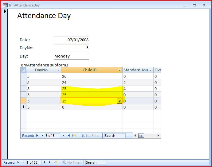 I have a subform with the field ChildID, and i need some code so that it is not possible to select the same value for ChildID more than once in the form. I have attached a image of what i am talking about, the highlighted fields show what i want the end user to not be able to do! Maybe some Onlostfocus code which displays a msgbox when repeating data is entered? Please help its for my coursework and we haven't even been taught VBA, they just expect us to do it! Thanks