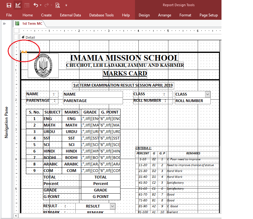 First of all I am not an expert in Ms access or any other database software, I only know basic about ms access, I am trying to create a school student database in which I try to create a school mark sheet of student for practice. I successfully created a mark sheet and design a report all this work great except printing of report. when i print the report (mark sheet) it gives extra 2 blank pages after each report. I have search for this every where including this forum and found that I should set page size to 8 inch which in conversion into CM it became 18CM approx and i have set it to 17CM but still it give me same printing result. I have also attach the database file..