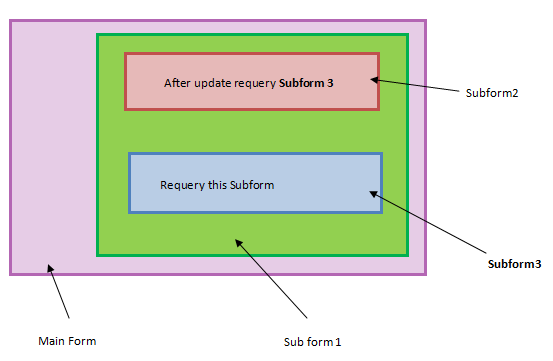 As the title says, i'm trying to requery a subform after update from a another subform which are both within a main subform that is on a main form.
