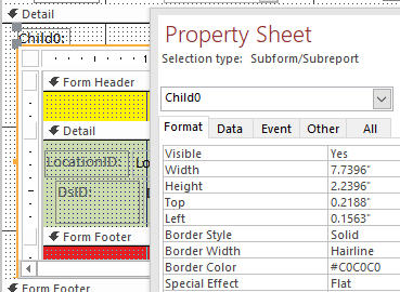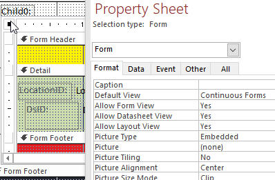 If I click once in the SubForm area, the Property Sheet Seelction shoes "Detail"