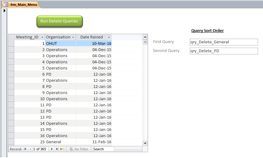 Just wondering if this can be done, the below code doesn't work. I want to be able to change the order in which certain queries are run by placing the query names in a text box on the main menu so it can the user can modify the names of the queries dynamically. The example below has 2 text boxes on the main menu with the names of the queries in the text box.