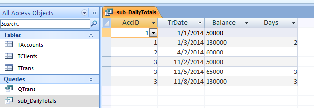 Now for the query you want to produce, I'm having trouble seeing the logic for which records gets the calculated fields. How come there are 4 records for AccID=3, TrDate=8/11/2014 and none of them have Days calculated?
