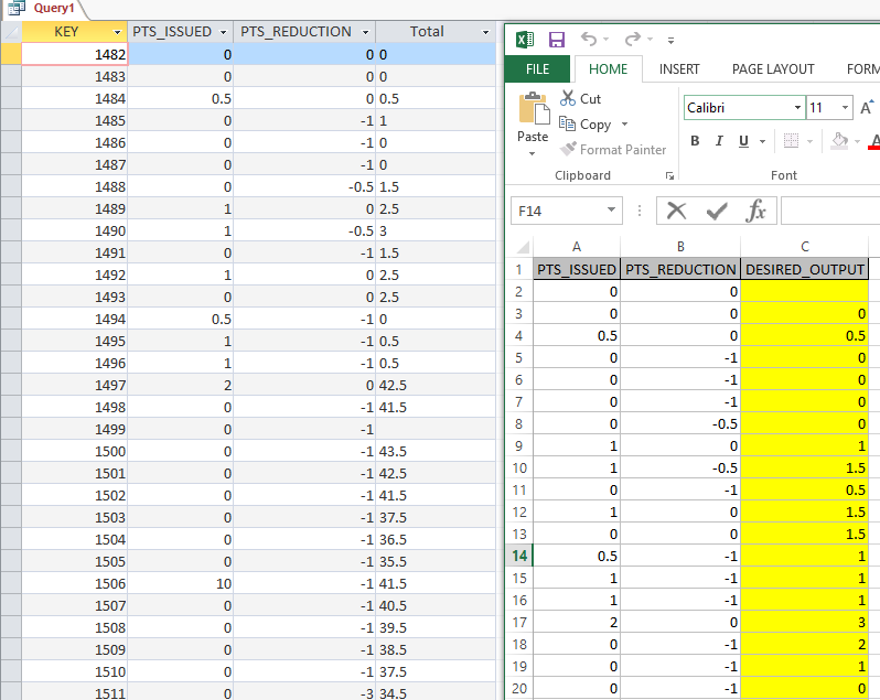 Here is the problem. I need to create a running total based on the sum of two fields [PTS_ISSUED] & [PTS_REDUCED] with one restriction. The total can never be less than 0. If it is less than zero, the totals reset with [PTS_ISSUED] as the new starting point.