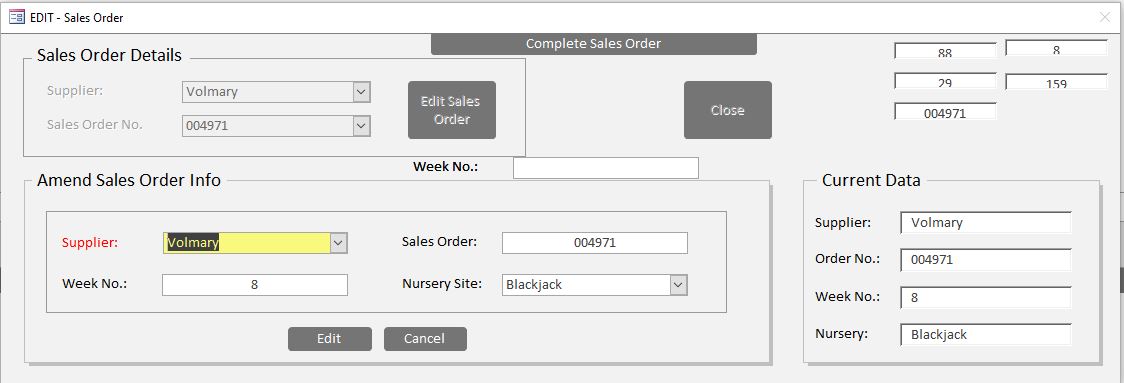 I have a form (image attached) I choose from a supplier from a combobox and based on the supplier chosen a list of sales orders is populated in a sales order combobox. ONce i have selected the sales order i want to edit i click eidt sales order. THis refreshes the record source qry based on the slection in the sales order cbo. IMage attached.
