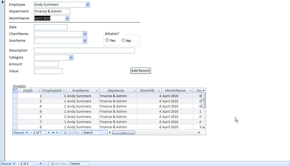 I've attached a screen shot. The thinking behind it is that the subform is based on a query which queries the expenses table for all records relating to the emplyee and month which is shown on the header of the main form.