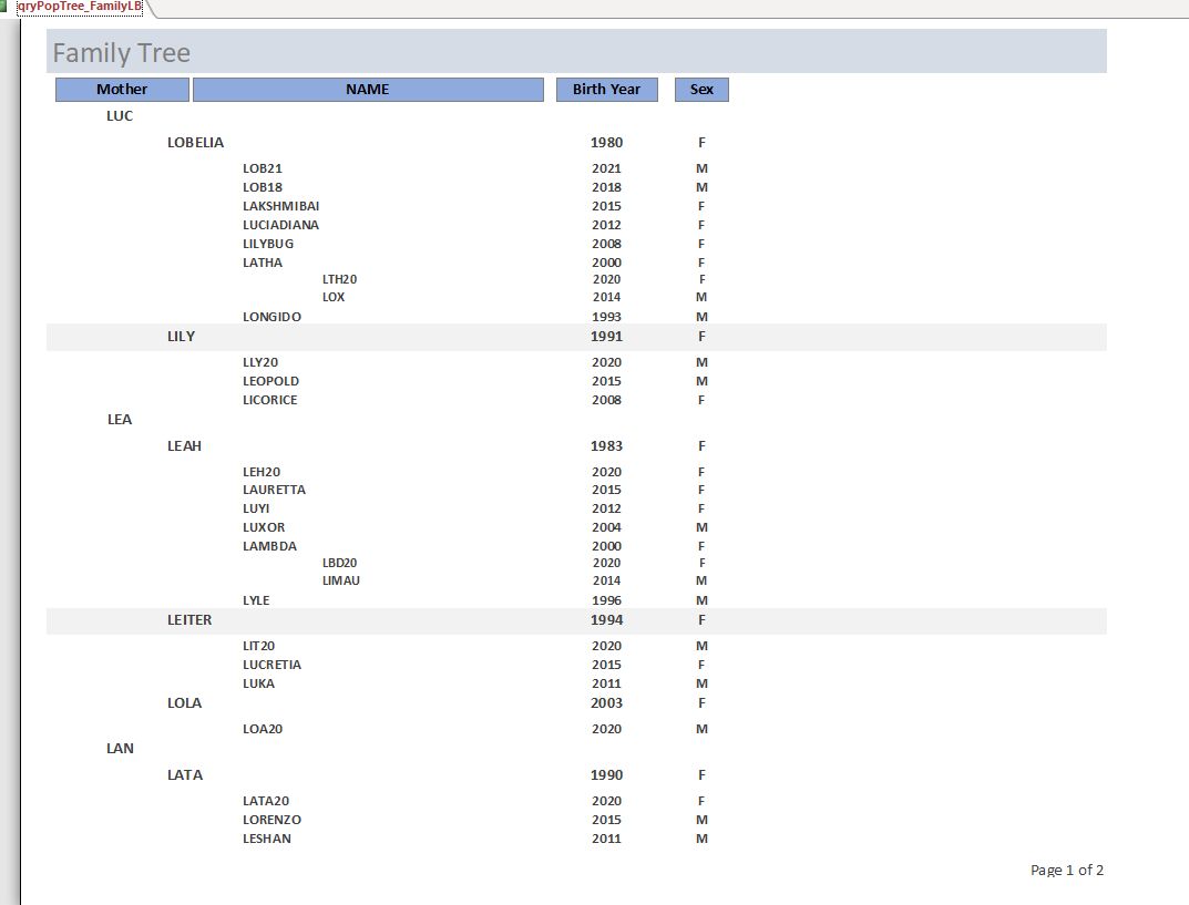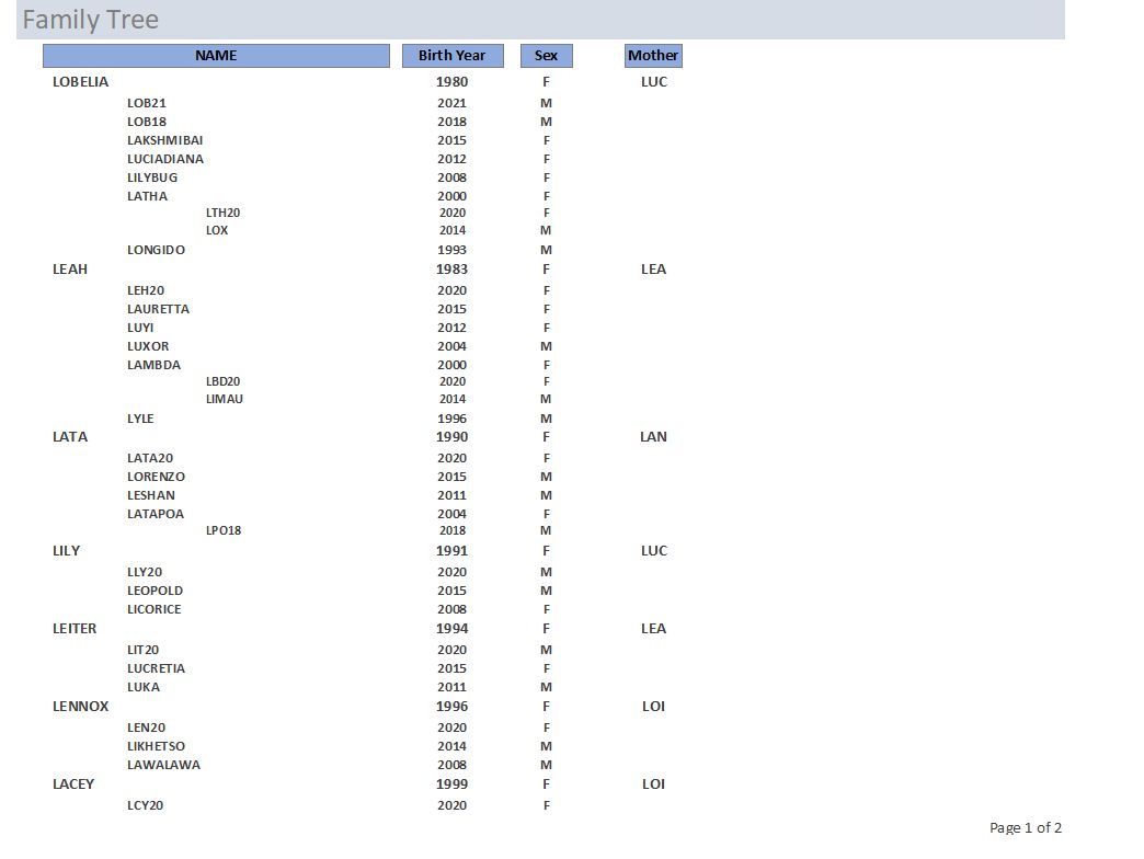 For example, Lobelia is the oldest family member in the example below; she was born in 1980, her mother is Lucia. Her two youngest are sons born this year and in 2018. Four daughters are alive and listed in descending date order, with Latha (her daughter born in 2000) with two of her own offspring, 'LTH20' and 'Lox', again listed in descending date order. Lily is Lobelia's oldest sister (same mother Lucia) with her kids listed and so on.