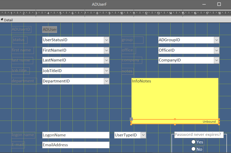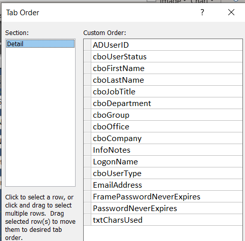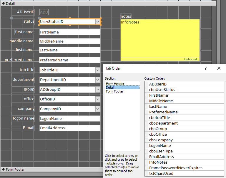 In my original code, when I try to type into the notes field [InfoNotes] a text box, it jumps to the cboUserStatus eacht time.