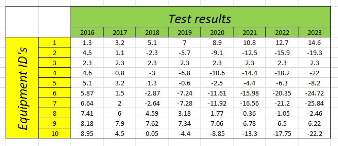 I need a table that would store all data on a test related to the same pieces of equipment every year. Each year we will perform said test with a form that access would generate on a report to carry in the field. once done the data would be brought back to the office and entered into the database, preferably with the same layout as the report for ease of entry.