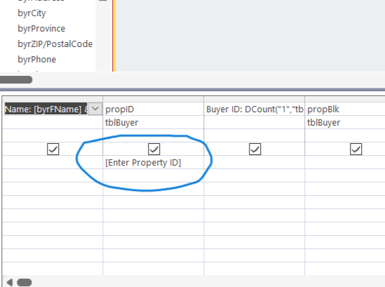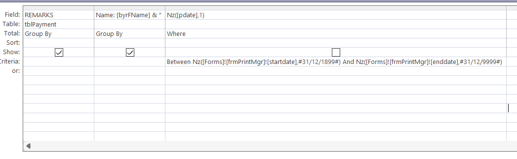 Pls consider the changes, It will be change to "[Forms]![frmPrintMgr]![txtPropertyID]". What would be the expression so that it will show all records if no criteria.