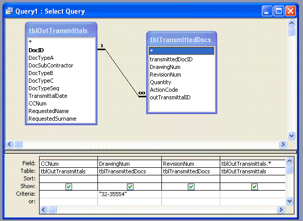 tblOutTransmittals and tblTransmittedDocs. A document is sent with a transmittal document which the recipient signs to confirm that they received it. I've created a query that will show all the drawings/documents and the information about the associated transmittals.
