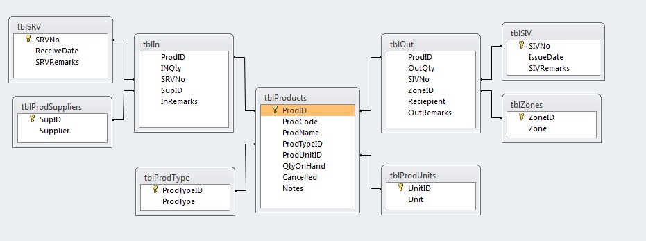 The store works on SRV (Store Receiving Voucher) and SIV (Store Issue Voucher). Products will be added based on SRV and will be issued out based on SIV. So far I have created the tables as you can see in the figure. One thing I am not understanding is where to keep the record of the Current Quantity of each product, lets say an Item has been added or issue out, it should be added or deducted accordingly from that specific products overall quantity. Right now I have a sample field within products table as you can see with the name QtyOnHand but that doesn't seem to be logical. Thanks.