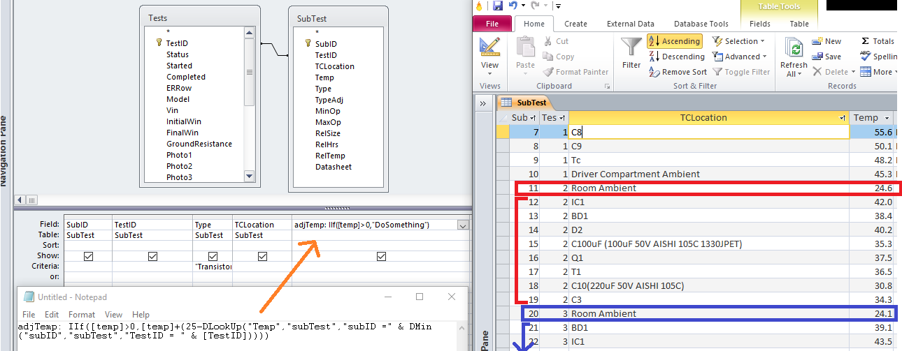 I have a parent table (Tests) that gives general information about a particular product and child table (SubTest) that shows the temperature (Temp) results of each component (TCLocation) where the product was tested.