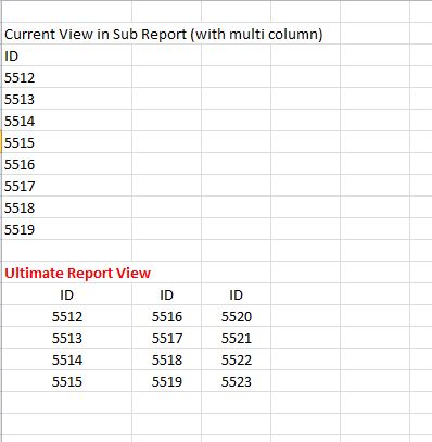 I need assistance. I am building a report in Access and I want to display one of my query results in a multiple columns in a snake format. I have created a report and added the desired number of columns I wanted to see. This method works fine in print view, but it does not stay in this form when I try to add the report as a sub report. I tried using the "top result" feature but I don't know how to select records x to y for the next column. Below is what I want to achieve. I just want to divide my data in multiple columns.