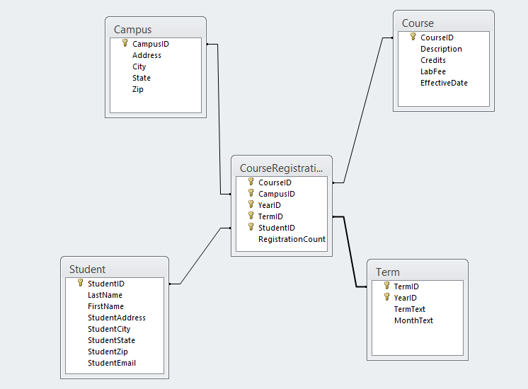 COURSE (CourseID, Description, Credits, LabFee, EffectiveDate)