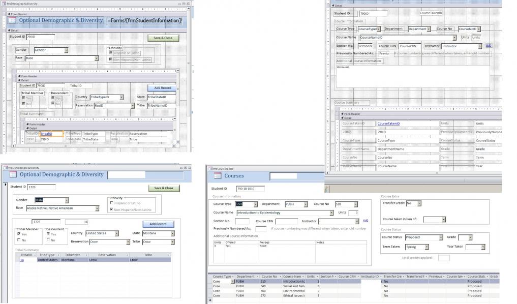 I have attached the design view and form view of both the Course form which works correctly and displays all records and the Demographic form which will only display the first record.