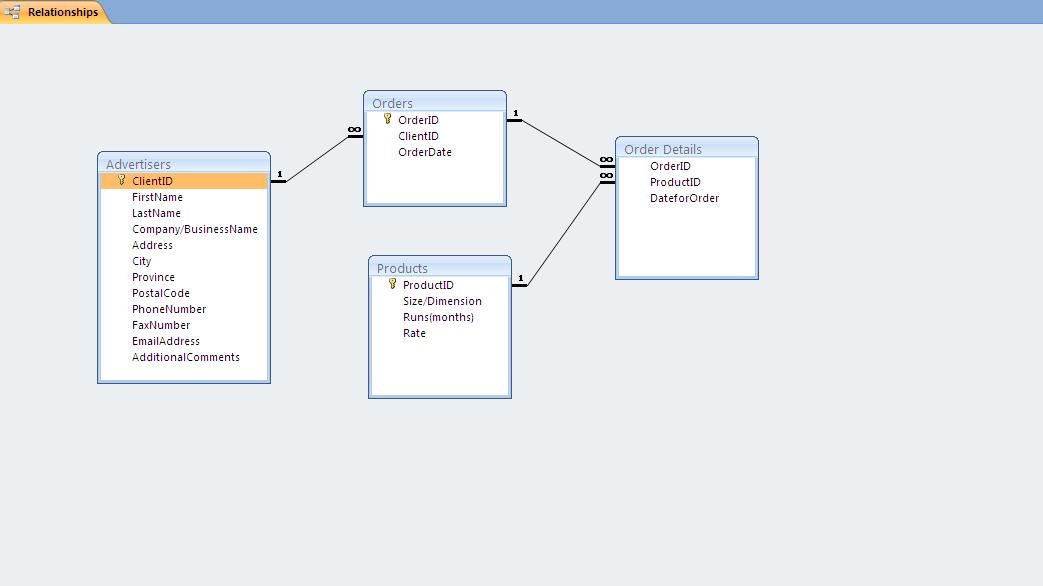 I have a small newspaper company. The newspaper makes money by advertisements from local business owners. Advertisers request specific sizes for their advertisement, and pay according to its size. Typically customers advertise for runs of 2, 3, or perhaps 10 times in the newspaper and receive discounts according to how many Ad Runs and Size/Dimension the customer wishes to purchase. I’ve attached the relationships on this thread.